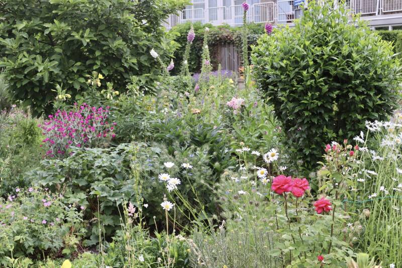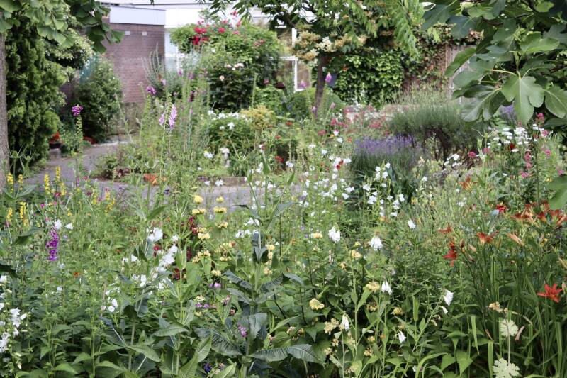 Marcel en Maroesja onderhouden het Albrachthof, een groene parel midden in Oudwijk. Opvallend weinig buurtgenoten kennen het plekje, zo pal achter Podiumoost Utrecht. Via de Bolstraat of de Bloemstraat kun je erin. “We hebben hier meer dan 300 soorten bloemen en planten staan! Moet je nagaan, ooit was dit 100% steen (zie archieffoto uit 1986), nu is het alsof je midden in de natuur staat. We hebben wel een probleem: water, of beter gezegd, een gebrek aan water. De vorige twee zomers waren erg droog, toen hebben we alles met gietertjes kraanwater in leven gehouden. Maar zo moet dat natuurlijk niet! Liever vangen we water op na regenbuien, bijvoorbeeld in watertonnen. Of in een ondergrondse wateropslag of een vijver. Dat blijkt echter heel lastig. We hebben medewerkers van Gemeent Utrecht, Wijkbureau Oost, Utrecht Natuurlijk, waterschap en allerlei fondsen gevraagd, ze reageren heel vriendelijk, komen kijken, maar … een oplossing is er nog niet. Hoe kan dat toch in een gemeente die meer groen en wateropvang wil?”